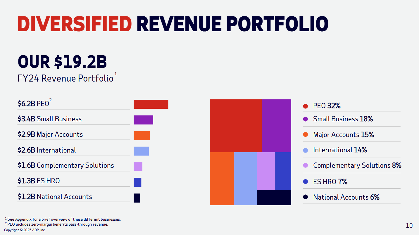 In der Investorenpräsentation gliedert ADP den Umsatz des Segments Employer Services noch einmal feiner auf. Dadurch lassen sich das Wachstum und die Performance abseits des Segments PEO der wichtigsten Kundengruppen „Small Business”, „Major Accounts”, „International”, „Complementary Solutions”, „ES HRO“ und „National Accounts” besser nachvollziehen. Die Einteilung erfolgt dabei nach den bedienten Marktsegmenten anhand der Kundengruppe und der vertriebenen Produkte. Ein Drittel des Umsatzes wird mit kleinen und mittelständischen US-Unternehmen (Small Business, Major Accounts) erzielt, während Großkonzerne (National Accounts) lediglich einen Anteil von 6 Prozent am Gesamtumsatz haben. Im Fiskaljahr 2025 betrug der Umsatzanteil des Segments Employer Services 68 Prozent.