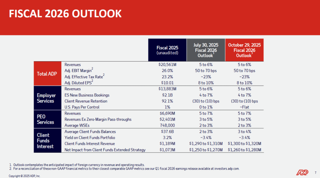 ADP berichtet über die beiden Segmente Employer Services und PEO Services. Die Zinserträge aus Client Funds Interest werden in beiden Segmenten generiert (Präsentation zum 1. Quartal im Fiskaljahr 2026, Folie 7)