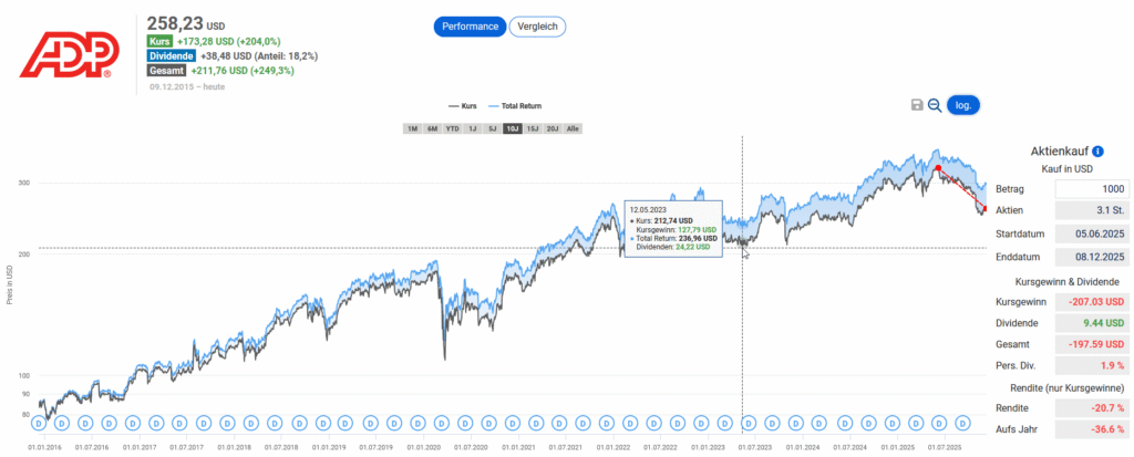 Trotz des jüngsten Kursrückgangs um 21 Prozent liegt die ADP-Aktie seit unserer letzten Analyse im Mai 2023 immer noch um 22 Prozent im Plus.