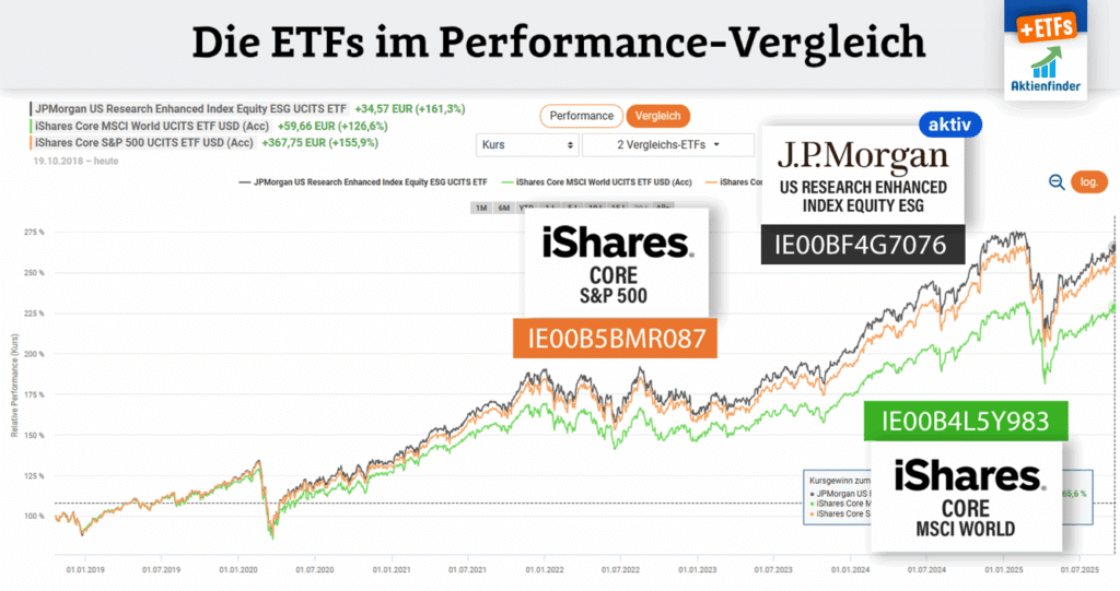 Der größte aktiv gemanagte ETF mit 9,3 Milliarden Euro Fondsgröße ist der thesaurierende ETF „JP Morgan US Research Enhanced Index Equity ESG“ mit der ISIN IE00BF4G7076. Sein Ziel ist eine Outperformance gegenüber dem S&P 500. Um diese Outperformance zu erreichen, werden Aktien mit dem höchsten Renditepotenzial leicht übergewichtet, während überbewertete Aktien leicht untergewichtet werden. Ein ambitioniertes Vorhaben, das laut der Kennzahlen im ETF-Finder jedoch tatsächlich gelingt. So punktet der ETF mit seinen 239 Aktien fundamental sowohl gegenüber dem MSCI World als auch gegenüber dem S&P 500 mit einem niedrigeren Klumpenrisiko von 65 Prozent und einer höheren Qualitätsdichte von 63 Prozent, was letztendlich zu einer Outperformance gegenüber dem MSCI World und dem S&P 500 seit Auflage im Oktober 2018 führt. Der ETF ist eine gute Alternative zu einem ETF auf den S&P 500 oder auch auf den MSCI World, wenn die dann fehlenden internationalen Aktien anderweitig abgedeckt werden.