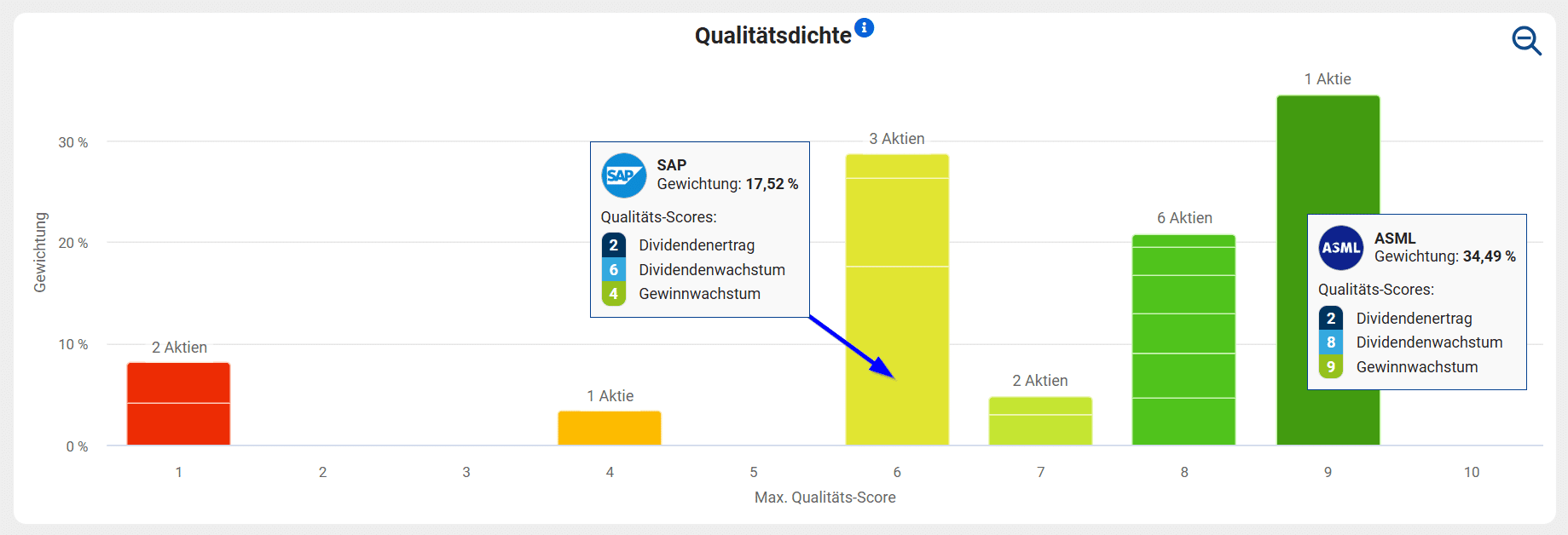 Aktiv gemanagte ETFs ersetzen die Gewichtung nach Marktkapitalisierung durch eigene Gewichtungsverfahren, und gelangen so oft zu einem deutlich geringeren Klumpenrisiko und einer niedrigeren Verklumpung als der MSCI World. Die zweite zentrale Kennzahl für die Analyse von ETFs ist die Qualitätsdichte, die den gewichteten Anteil an Qualitätsaktien im ETF bestimmt und beim MSCI World bei 56 Prozent liegt.