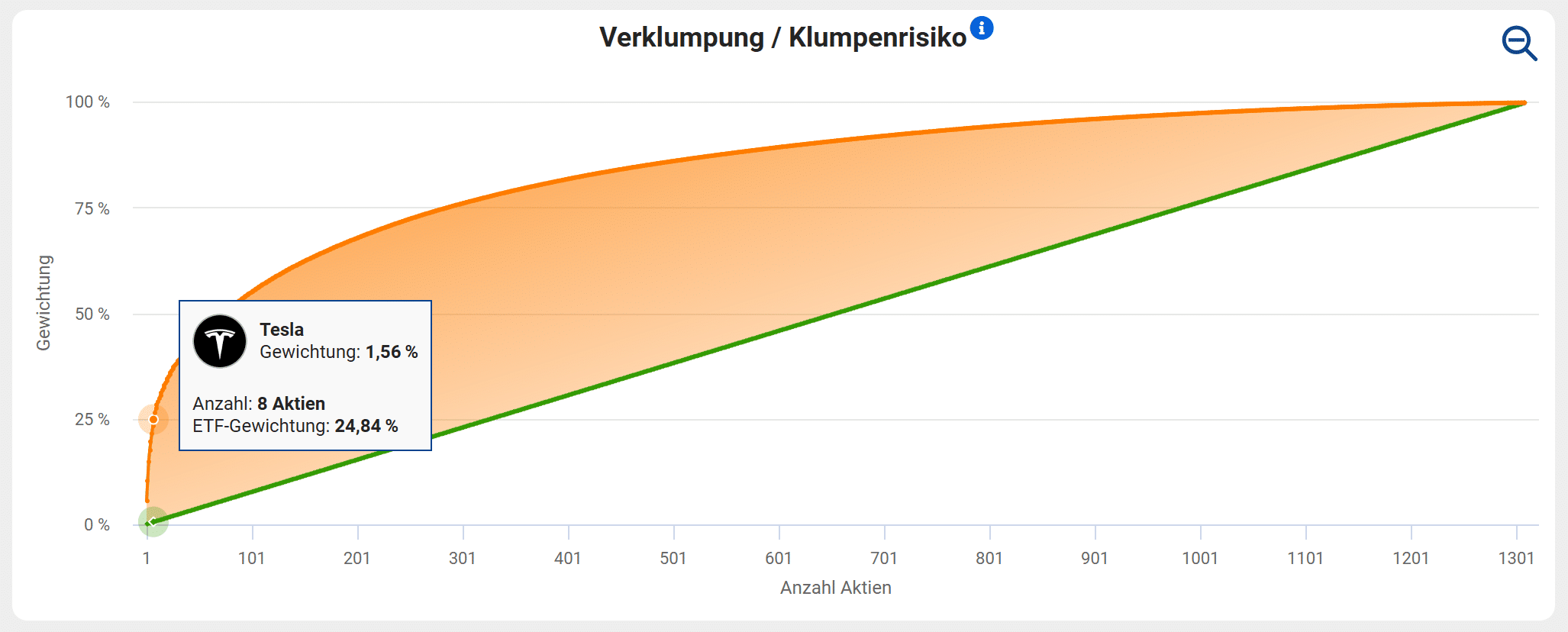 Bei einem Investment in aktiv gemanagte ETFs setzt du auf deutlich weniger Aktien als bei einem Welt-ETF. Zwar enthält der umfangreichste aktiv gemanagte ETF immerhin 3.188 Aktien, im Schnitt erhalten alle anderen aktiv gemanagten ETFs jedoch lediglich knapp über 80 Aktien. Beim kleinsten sind es sogar nur 31 Titel. Die Diversifikation eines ETFs hängt allerdings nicht nur von der Anzahl der in ihm enthaltenen Aktien ab, sondern vor allem von deren Gewichtung. Das Paradebeispiel ist der MSCI World, der trotz über 1.300 Aktien auf eine relativ hohe Verklumpung von 69 Prozent kommt. Die hohe Verklumpung entsteht, weil nur 8 Aktien bereits knapp ein Viertel der gesamten Gewichtung im MSCI World ausmachen, während hunderte kleinerer Aktien mit unter 0,01 Prozent Gewichtung faktisch irrelevant für den Kursverlauf des MSCI World sind.