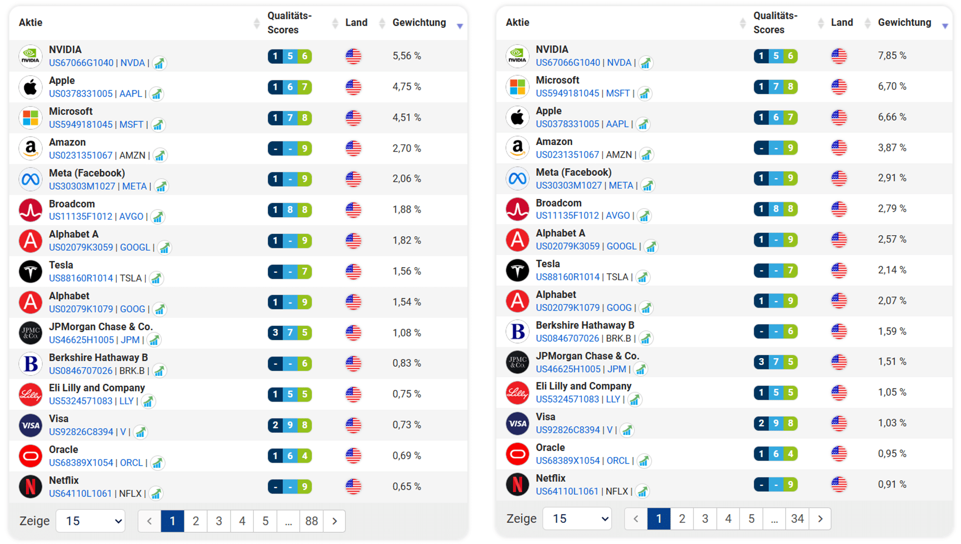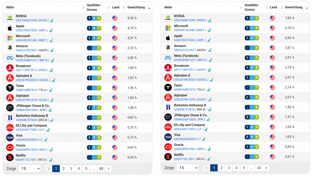 In Folge dessen unterscheiden sich MSCI World und S&P 500 bezüglich ihrer 15 größten Positionen kaum. Lediglich die Gewichtung der US-Aktien fällt im MSCI World etwas geringer aus.