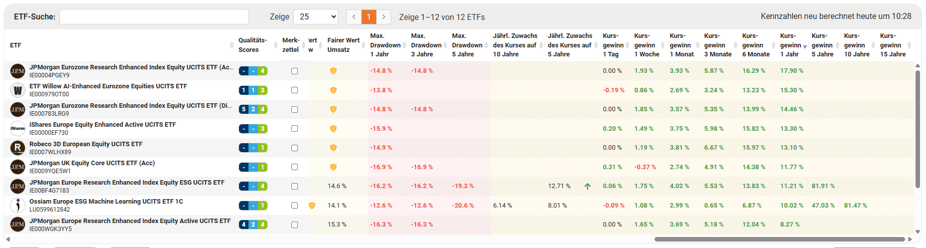 Aktiv gemanagte ETFs auf europäische Aktien punkten zwar mit einem niedrigen Klumpenrisiko, lassen mit einer Qualitätsdichte von maximal 39 Prozent jedoch zu wünschen übrig. Auf Jahressicht schlugen allerdings acht von zwölf Europa-ETFs den MSCI World geringfügig. Während auf 5-Jahressicht kaum eine Aussage getroffen werden kann, weil lediglich zwei Europa-ETFs so lange auf dem Markt sind, die beide gegenüber dem MSCI World underperformen.