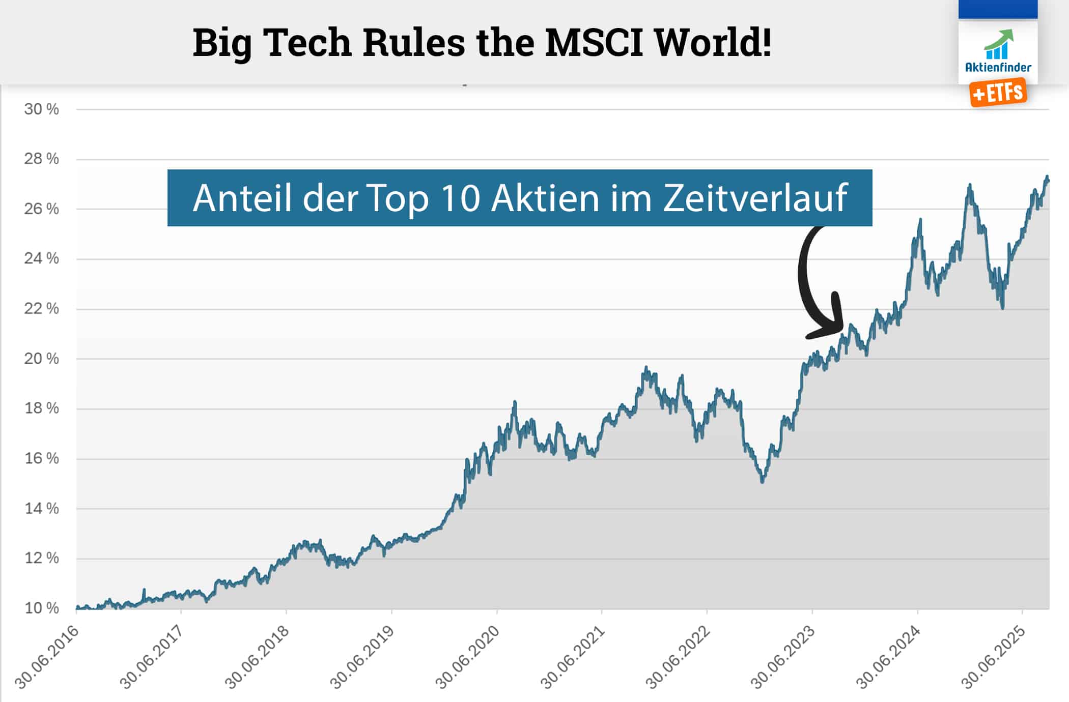 Der MSCI World ist heute ein anderer Index als noch vor zehn Jahren. Während die Top 10 Aktien damals rund zehn Prozent des MSCI World ausmachten, liegt der Anteil der heutigen Top 10 bei 27 Prozent. Früher war der MSCI World viel stärker diversifiziert und Big Tech spielte im Welt-Index nicht so eine dominante Rolle wie heute.