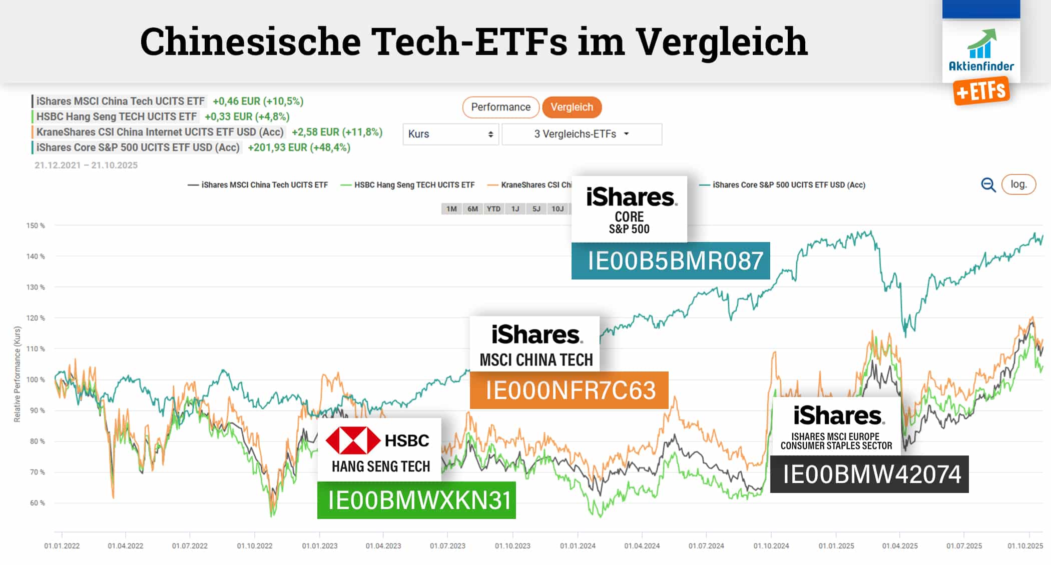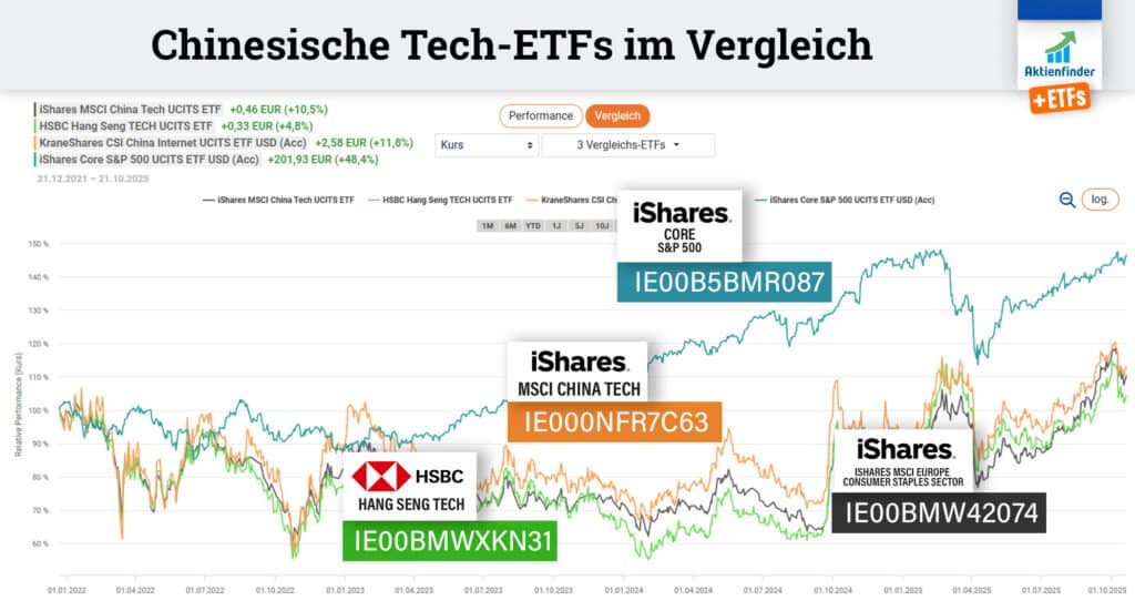 Die drei nach Fondgröße bedeutendsten Themen-ETFs beschäftigen sich mit chinesischen Technologie-Aktien und haben mit Jahresrenditen zwischen 21 und 36 Prozent in Euro zwar außergewöhnlich gut performt. Zuvor ging es ab 2021 mit chinesischen Technologie-Aktien jedoch stark bergab und liefen die betreffenden ETFs einige Jahre seitwärts.