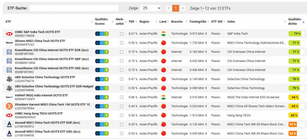 Zudem kannst du auch in Themen-ETFs außerhalb Europas und Nordamerikas investieren, wobei Asien in den Vordergrund rückt. Bei einem Blick in den ETF-Finder fällt die insgesamt hohe Qualitätsdichte der asiatischen ETFs mit Werten von meist deutlich über 60 Prozent auf. Bei 10 von 12 asiatischen Themen-ETFs liegt der Länderschwerpunkt klar auf China. Nur zwei Themen-ETFs befassen sich mit dem indischen Aktienmarkt.