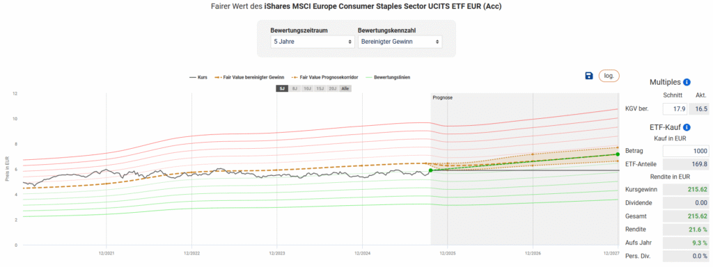 Wenig überraschend lässt sich mit Konsumgüterunternehmen keine Outperformance gegenüber ETFs erzielen, die mit Big Tech gefüllt sind. Aber im Rahmen der Diversifikation halten wir ETFs wie diesen für geeignet, zumal viele der in ihm enthaltenen Unternehmen günstig bewertet sind und der ETF in Summe moderat bewertet ist, was zu einer Renditeerwartung bis Ende 2027 von jährlich 9 Prozent führt.
