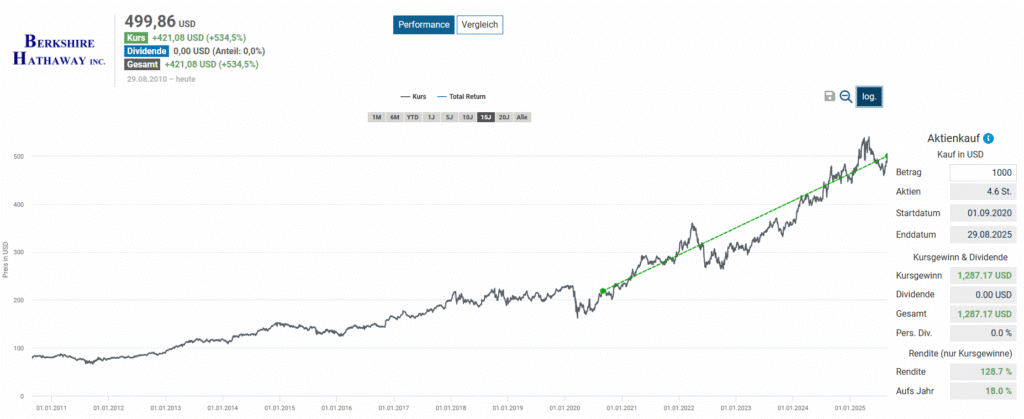 Der Erfolg der Berkshire Hathaway Aktie ist maßgeblich von Warren Buffett geprägt. Er gilt als einer der erfolgreichsten Investoren aller Zeiten. Auch in der jüngeren Vergangenheit war die Berkshire Hathaway mit Kursgewinnen von 128 Prozent in den letzten 5 Jahren ein lohnenswertes Investment.