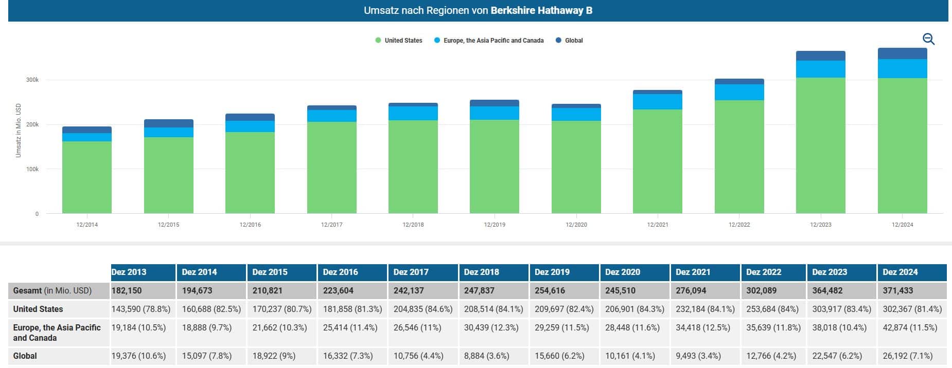 Der US-amerikanische Heimatmarkt erzielt insgesamt einen Umsatz von über 302 Milliarden US-Dollar und trägt damit zu über 81 Prozent zum Gesamtumsatz bei. In dieser Übergewichtung findet sich einer von Buffets Grundsätzen wieder, nämlich „never bet against America“. Die restlichen 19 Prozent des Gesamtumsatzes oder 69 Milliarden US-Dollar entfallen auf die anderen Länder weltweit. Ein kleiner Anteil des Gesamtumsatzes kommt auch von einer deutschen Tochtergesellschaft, die in Hamburg ihren Firmensitz hat. Die Motorradfahrer unter euch werden sicherlich den Händler für Motorradbekleidung und Motorradzubehör Louis kennen, der seit 2015 zu Berkshire Hathaway gehört.