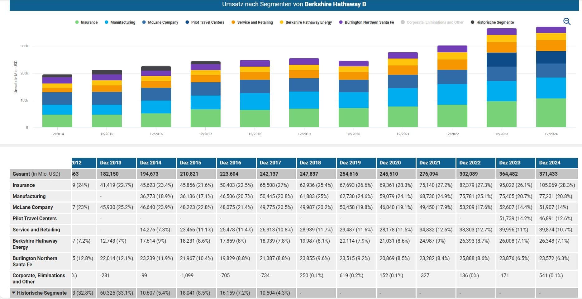 Das umsatzstärkste Segment ist Insurance. Mit einem Umsatz von rund 105 Milliarden US-Dollar trägt dieses Segment zu 28 Prozent des Gesamtumsatzes bei. Mit einer Bruttomarge von fast 27 Prozent ist dieses Segment aktuell das zweitprofitabelste Segment von Berkshire. Das größte Unternehmen im Versicherungssegment ist die Government Employees Insurance Company oder kurz GEICO. Dieses Unternehmen ist im Erstversicherungsgeschäft in den USA tätig und versichert Fahrzeuge und Immobilien. Das Segment Insurance deckt neben dem Erstversicherungsgeschäft auch das Rückversicherungsgeschäft mit dem Tochterunternehmen General Re ab.