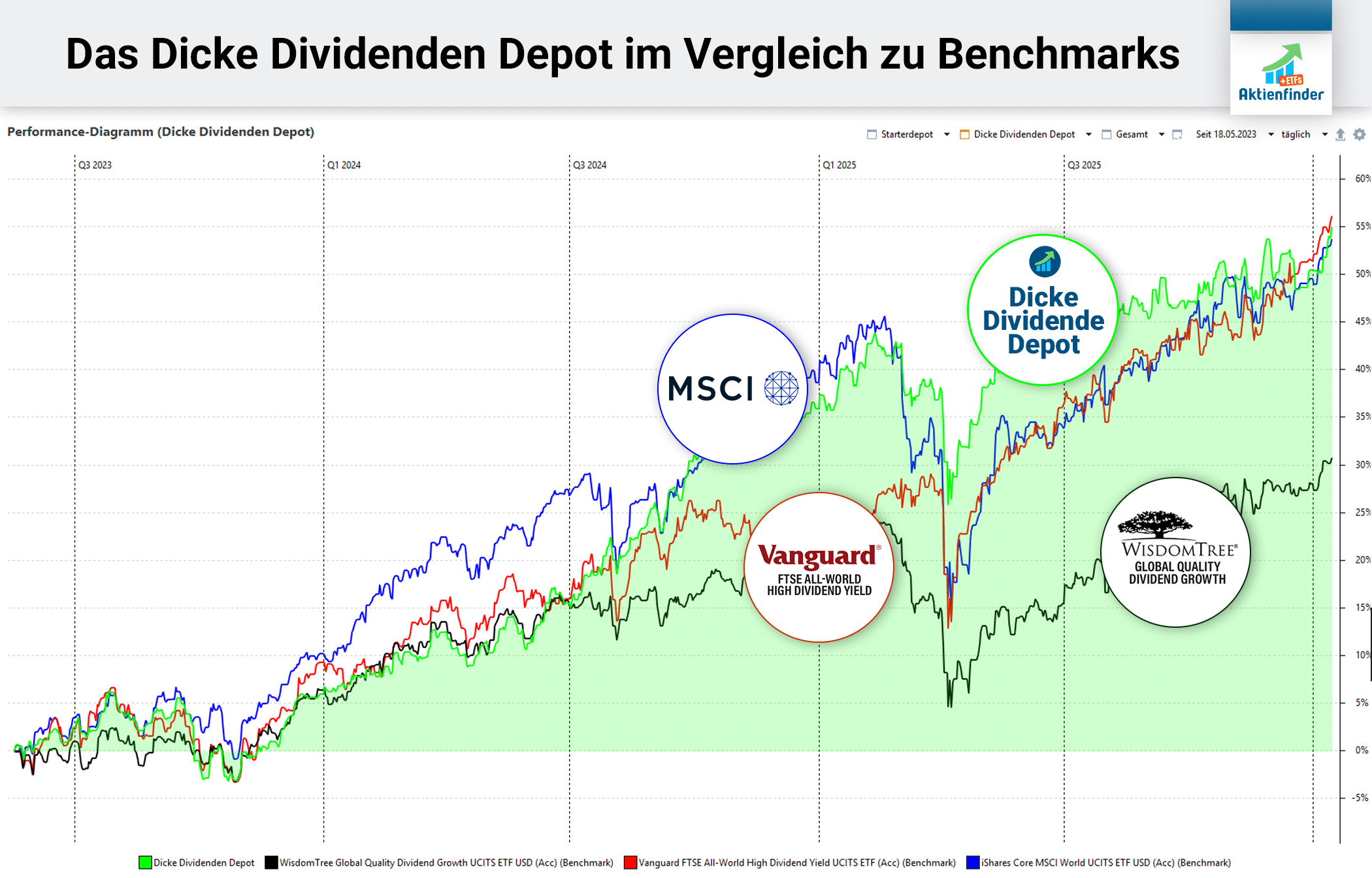 Den auf Dividendenwachstum ausgerichteten WisdomTree-ETF konnte das Dicke Dividenden Depot hingegen deutlich outperformen. Mit dem MSCI World liegt das Dicke Dividenden Depot gleich auf, der allerdings nicht der richtige Benchmark für unser Depot ist.