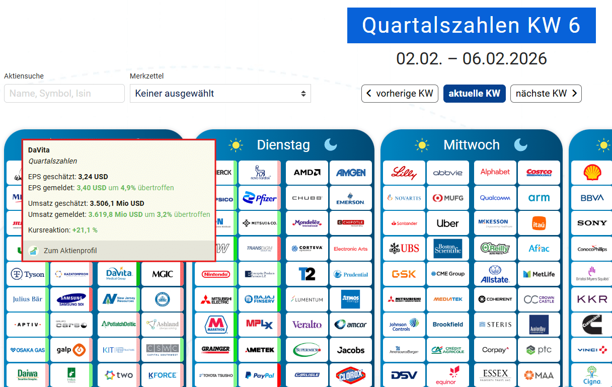 Auch in der aktuell laufenden Berichtssaison geht es ordentlich zur Sache. Microsoft verliert seit der vergangenen Woche gemeldeten Quartalszahlen deutlich aufgrund hoher Investitionsausgaben, der teilweisen Abhängigkeit von OpenAI und der Gewinn-Konzentration im Softwaregeschäft. Andererseits konnte sich das eher unbekannte Dialyseunternehmen DaVita nach den Quartalszahlen mit einem unmittelbaren Kurssprung von über 20 Prozent und über 30 Prozent in den Folgetagen behaupten. Wir haben DaVita im Oktober letzten Jahres vorgestellt.