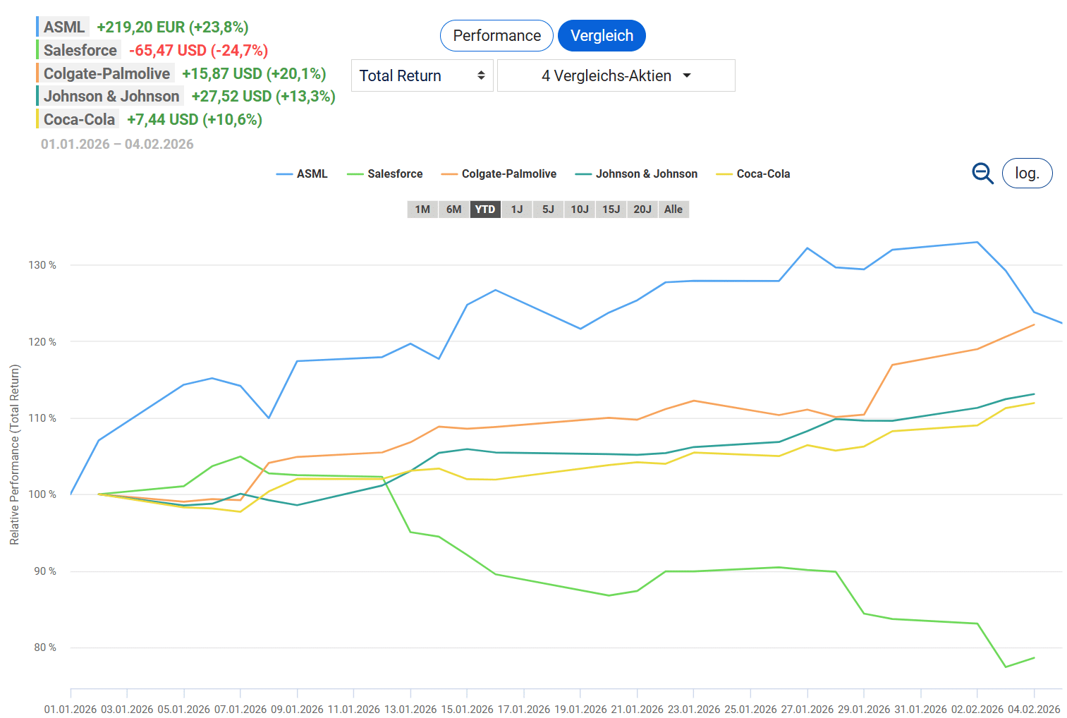 Doch auch zwischen den einzelnen Sektoren zeichnen sich eindeutige Trends ab. Die Grafik unterhalb zeigt das am Beispiel einiger unserer bereits analysierten kaufenswerten Aktien der Vergangenheit seit Jahresbeginn sehr deutlich. Software-Aktien wie jene von Salesforce oder Adobe stehen unter Druck aufgrund möglicher KI-Disruption, während defensivere Basiskonsumgüteraktien oder Pharmawerte wie Colgate-Palmolive, Coca-Cola, PepsiCo oder Johnson & Johnson massiv zulegen können. Auch die Aktie von ASML als Chipmaschinenbauer profitierte zuletzt. Die unten gezeigten Performanceunterschiede sind auf Jahres- oder sogar Fünfjahressicht sogar noch deutlicher. In der Summe finden sich somit zwar auch Software-Verlierer unter unseren kaufenswerten Aktien, doch die gezielte Auswahl von defensiven Qualitätsaktien hält die Gesamtperformance dennoch hoch.