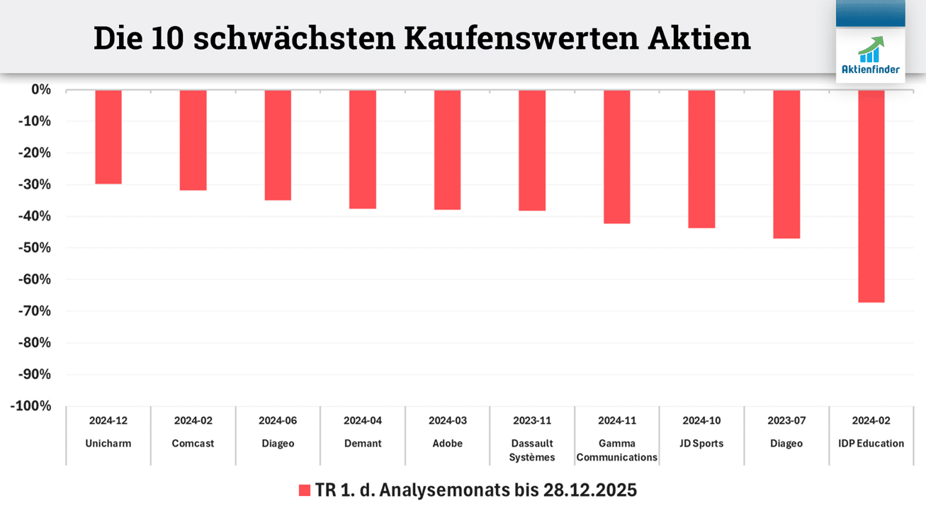 Der britische Spirituosenkonzern Diageo ist mit minus 35 Prozent und minus 47 Prozent gleich zweimal unter den „Flop 10“ vertreten. Auch Adobe ist seit der ersten Analyse im März 2024 mit minus 38 Prozent unter den schwächsten Aktien. Vor allem dieser Aktie hielten wir bei Kaufenswerte Aktien die Treue. Nach drei Analysen lägen wir mit Adobe im Durchschnitt nur 16 Prozent im Minus, weil sich der durchschnittliche Einstandskurs so laufend vergünstigt hätte. Die IDP Education Aktie lieferte mit Abstand die schlechteste Performance. Das Geschäft mit Studierendenaustauschprogrammen leidet unter politischen Migrationsbeschränkungen.