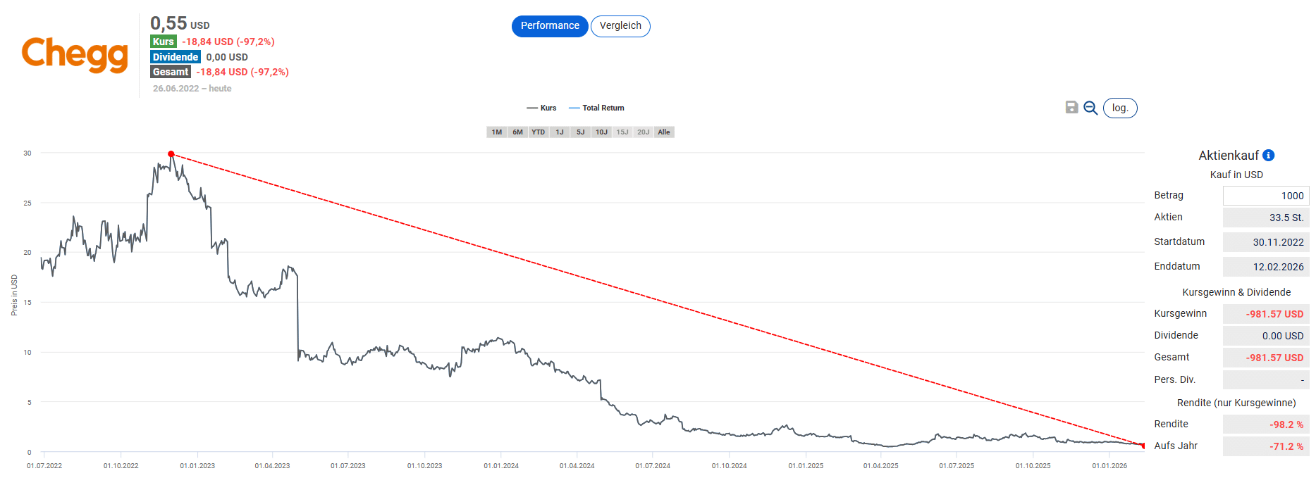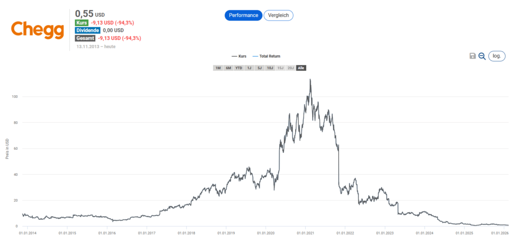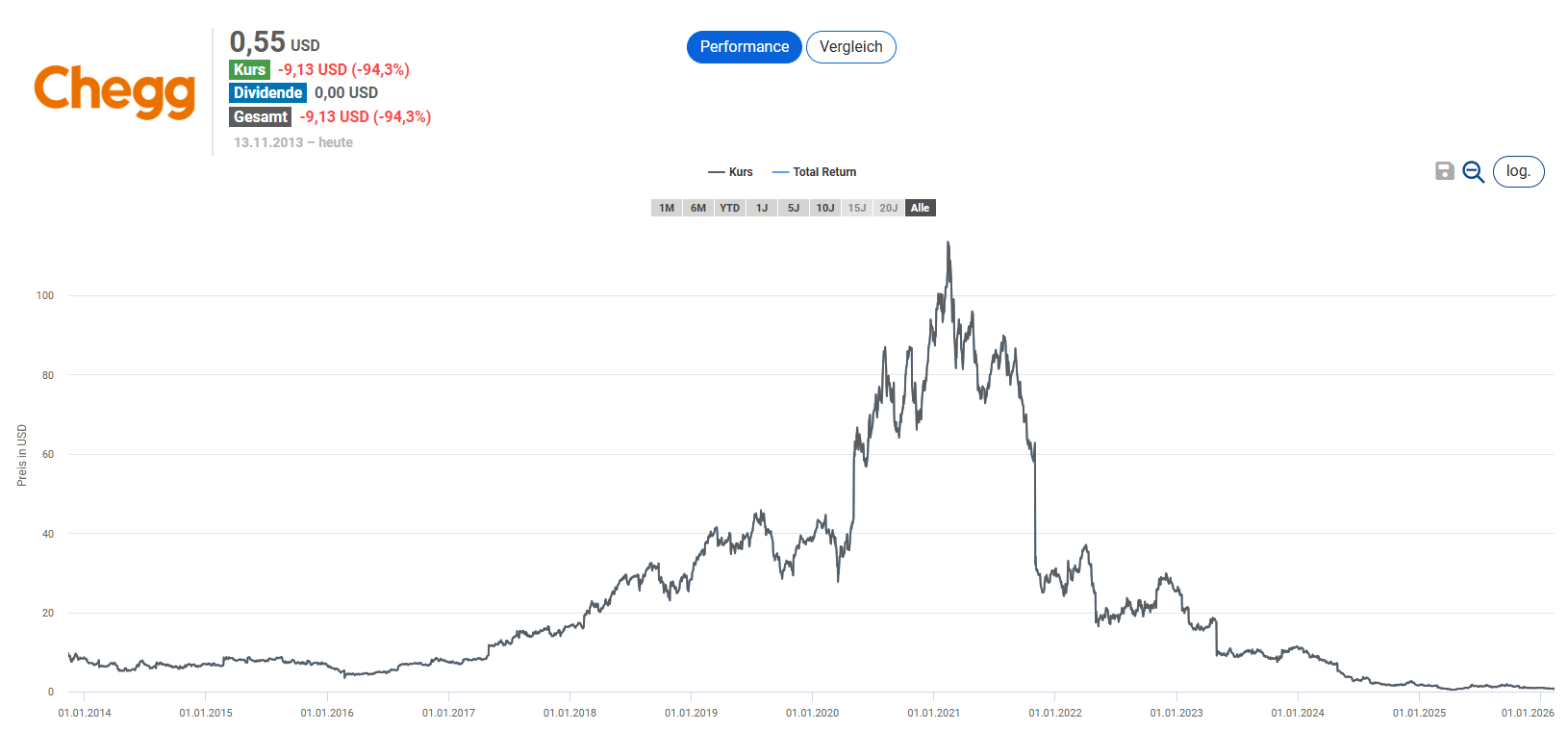 Ein Paradebeispiel für die KI-Disruption eines Geschäftsmodells ist die Chegg-Aktie, die vor allem während der Corona-Pandemie sehr gefragt war, als die Nachfrage nach virtuellem Lernen seitens Schülern und Studenten boomte. Die Aktie schoss nach dem Corona-Crash um bis zu 310 Prozent auf über 113 US-Dollar. Heute ist die Aktie nicht einmal mehr einen US-Dollar wert.