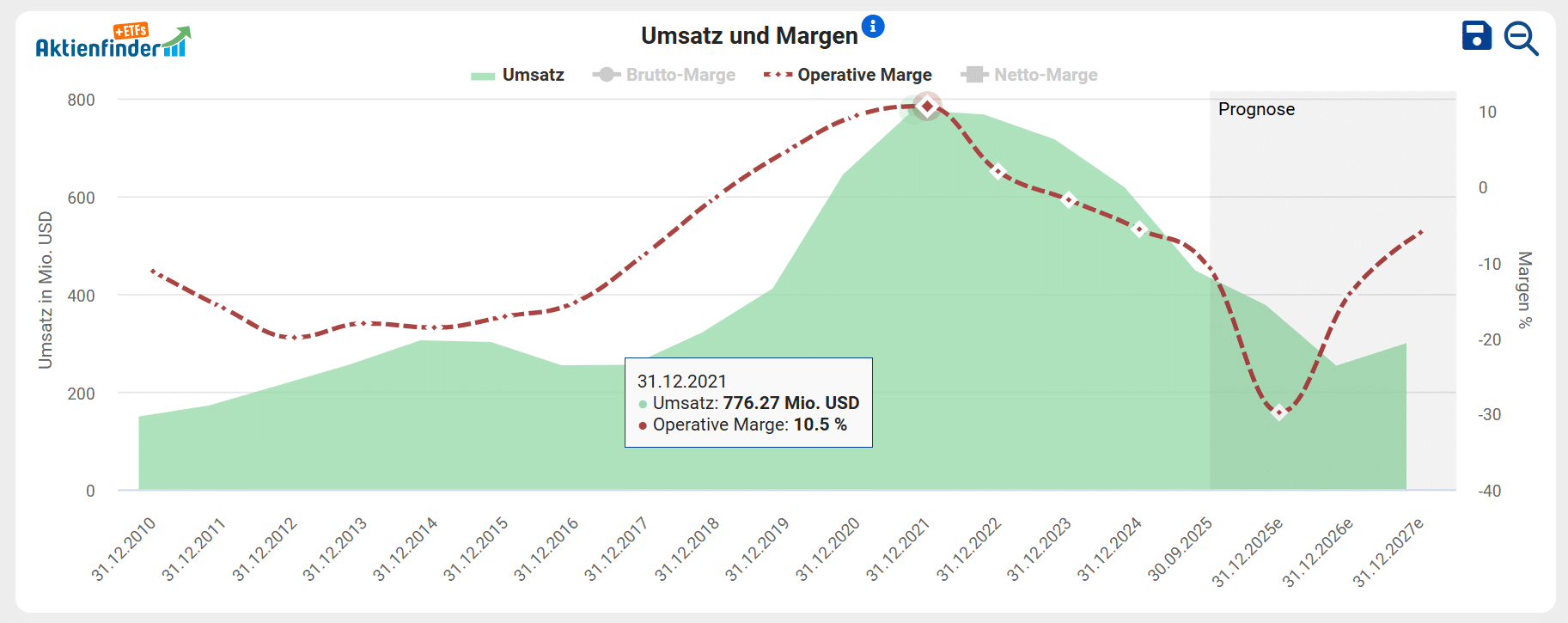 Im Geschäftsjahr 2021 lag der Umsatz noch bei 776 Millionen USD. Für das laufende Geschäftsjahr wird er nur noch auf 376 Millionen USD geschätzt. Seit dem Launch der LLMs hat sich die Abwärtsdynamik sogar seit 2023 beschleunigt. So sank der Umsatz 2022 um ein Prozent, im Jahr 2023 um 7 Prozent, 2024 um 14 Prozent und für das bereits abgeschlossene Geschäftsjahr 2025 wird sogar ein Umsatzrückgang von 39 Prozent erwartet. Zudem sinkt die Marge nicht nur wegen der stark rückläufigen Abonnementzahlen, sondern auch wegen des Preisdrucks durch kostenlose KI-.