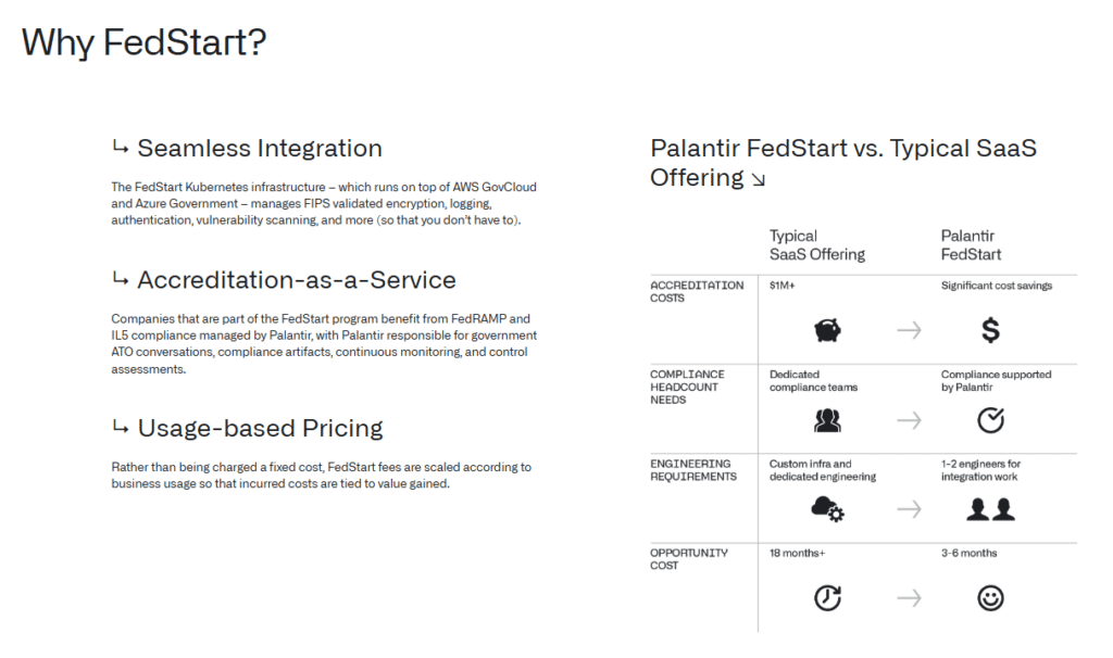 Auch Palantir überträgt dieses Prinzip auf sein Ökosystem. Über Palantir erhalten Drittanbieter einen beschleunigten Marktzugang zu US-Regierungsbehörden, ohne langwierige Zertifizierungsprozesse durchlaufen zu . Dies wird erreicht, indem Palantir seinen Kunden die Plattform Palantir FedStart bereitstellt, sodass Drittanbieter die bereits bestehende Zertifizierung der Plattform nutzen können. So können Unternehmen die strengen und kostspieligen Sicherheitshürden der US-Behörden in Monaten statt Jahren durchlaufen und ihre Produkte direkt in das sensible Regierungsnetzwerk integrieren.
